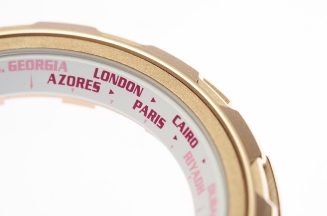 使用者只需要旋转那个经微喷砂处理的5N红金表圈,选定城市,时间就会自动跳转。这种操作体验,符合现代人对“高效”与“隐形奢华”的追求。表壳采用5N红金与五级钛合金的组合,经抛光和丝光打磨,呈现出一种优雅的廓形。这显示出品牌试图在硬核运动之外,希望占据更多商务与休闲场景。