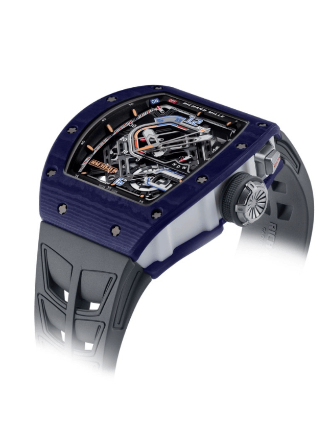 更有意思的是材质的运用。新款RM 30-01引入了Dark Blue Quartz TPT®深蓝色石英纤维和TZP黑色陶瓷。这是RICHARD MILLE首次在RM 30-01系列中引入彩色TPT®材质,灵感源自天空与海洋。这种对新材料的色彩探索,显然是想让技术显得不那么冰冷,而是多了一份视觉上的层次感。