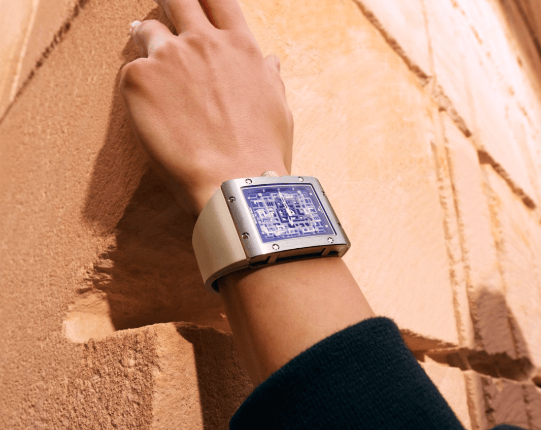 这款表搭载的CRMA9机芯是专为长方形表壳研发的,镂空设计让光线可以毫无阻碍地穿透表身。其中Terracotta Quartz TPT®赤土色石英纤维款,其色调是通过将硅线在彩色基质中浸渍、堆叠、加热而成,呈现出一种原始、粗砺却又极其精致的质感。这种设计不再是为了展示“我有多复杂”,而是为了传达一种独特的都市美学和建筑感。