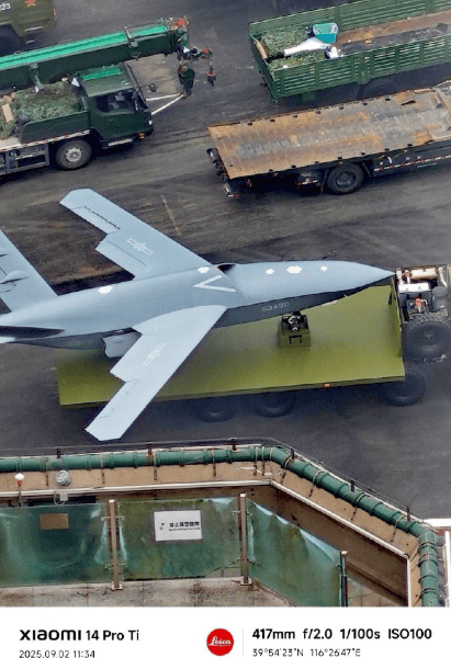 这个卡车尺寸超长,大约是三辆重卡的长度,然后上面带着一个大大的舰载机,生怕外国记者看不见。