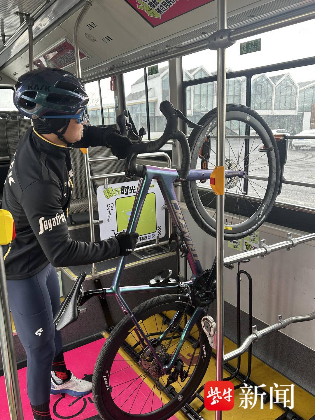 1月5日,扬子晚报/紫牛新闻记者登上了这辆“骑行友好公交”。记者看到,车内已拆除部分前排座椅,取而代之的是10组金属支架,可竖向固定自行车前轮、后轮及中轴。苏州公交集团工作人员介绍,目前仅限轮径28英寸以下、车长180厘米以内的非电动自行车上公交,乘车时需自行固定车辆,注意安全距离。“车上的架子很稳,放上去不会晃,坐下来也不挤。”骑行爱好者许先生成为该公交的首批体验者,他骑了近十年,常在北太湖一带活动,“以前车胎爆了,只能推十几公里回去;现在骑到站点,预约好的公交就能接你走,太省心了。”“我们不是凭空设计的。”苏州公交集团新区公司第一营运分公司副经理马飞介绍,车辆改造前,团队专程将公交车开到苏州环太湖自行车公园,邀请骑手带着真实车型上车测试。“支架的位置、间距、高度,都是根据不同车型反复调整的结果,就是为了让骑友用得放心。”据悉,该线路采用“提前一日线上预约、按预约量发车”模式,票价为10元/人/车。