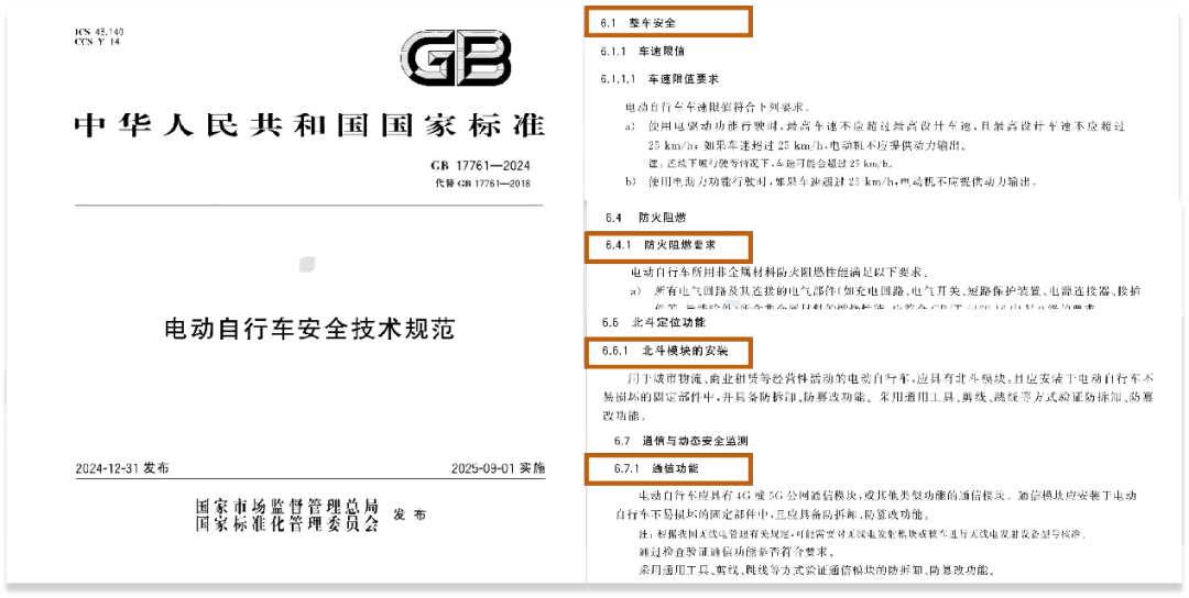 为了确保限速及行驶安全,新车需要提高制动性能、新增电动机低速运行转矩要求,强制增加电池组、控制器、限速器的防篡改功能。同时提高智能化程度,规定新车必须具备通信、动态安全监测等功能。此外也对材料的使用做出明确的限制,塑料使用量不得超过整车质量的5.5%、非金属材料需要防火阻燃。