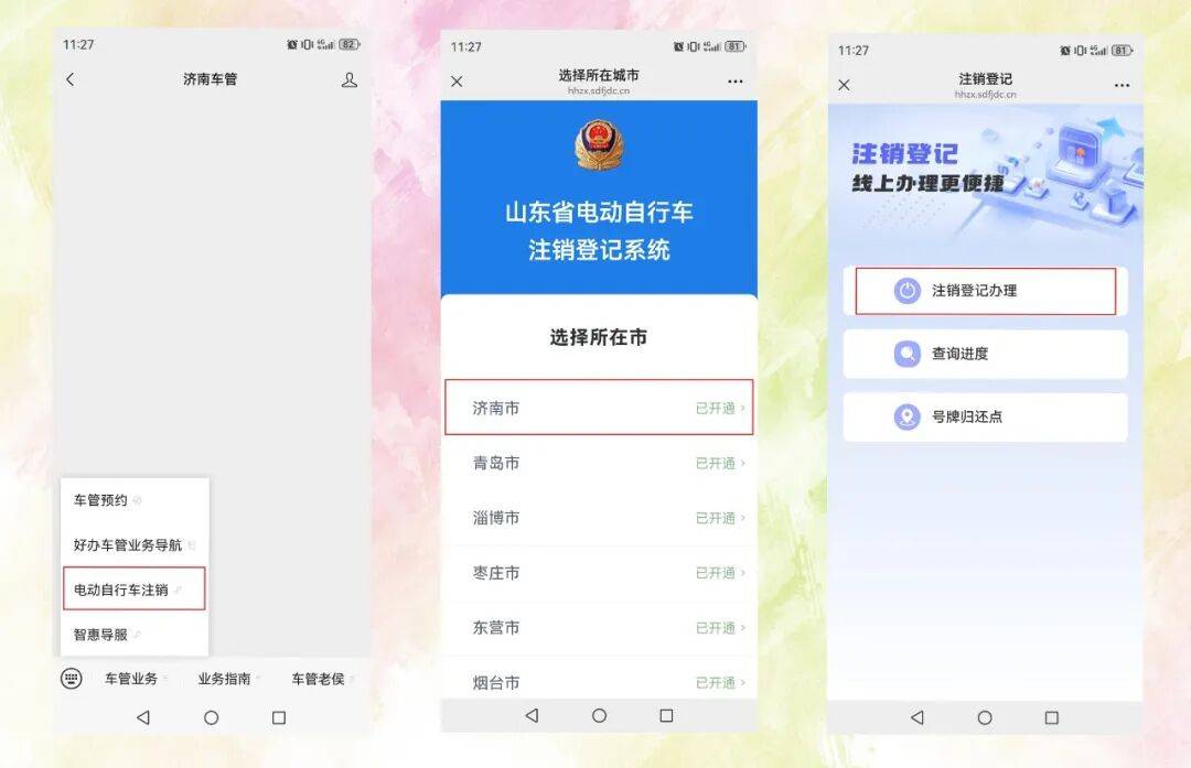 进入济南车管微信公众号,在车管业务栏,选择“电动自行车注销”,进入“山东省电动自行车注销登记系统”,选择所在城市“济南”,选择“注销登记办理”,根据提示填写信息后提交。