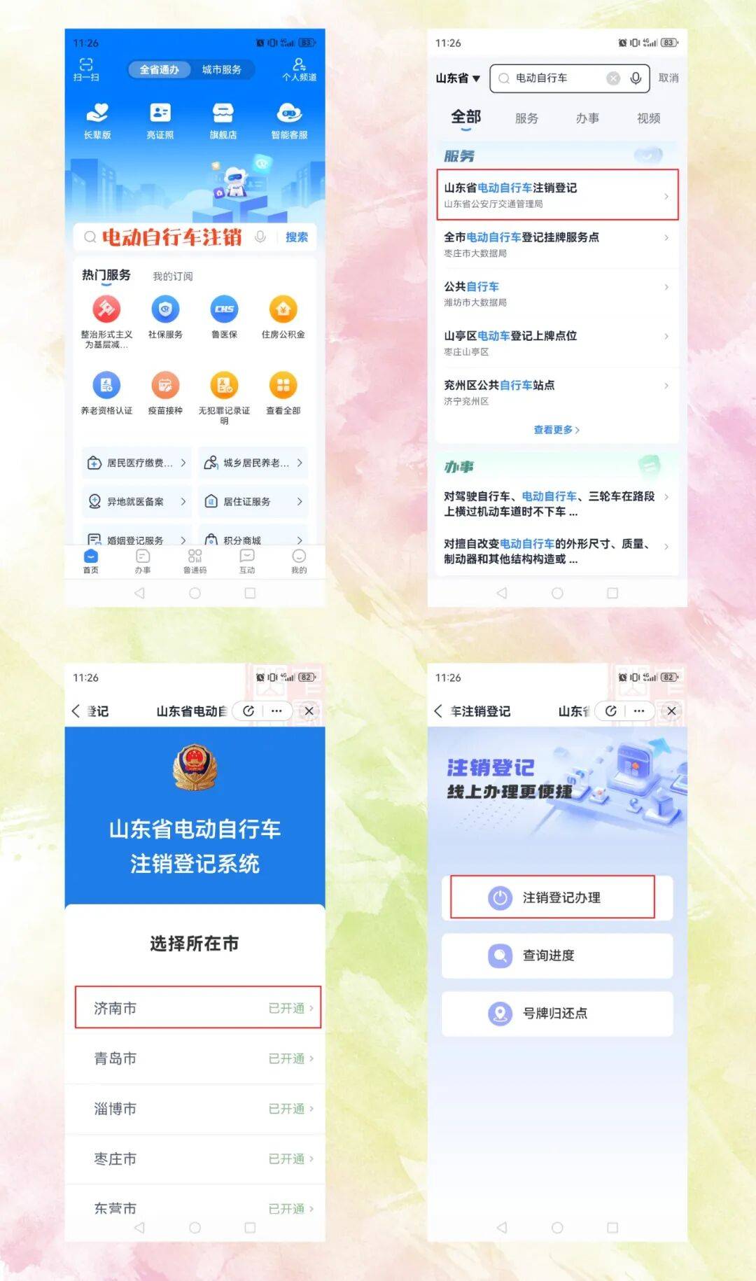 在全省通办页面下,搜索“电动自行车注销”,在服务栏选择“山东省电动自行车注销登记”,即可进入“山东省电动自行车注销登记系统”,选择所在城市“济南”;选择“注销登记办理”,根据提示填写信息后提交;
