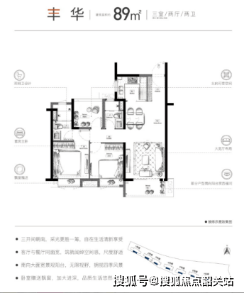 建面约89㎡经典刚需三房,格局方正规整,动静分区清晰,规避空间浪费。LDK一体化公共区域设计,打通客厅、餐厅、阳台空间,拉伸视觉尺度,日常会客、家庭聚餐更显开阔。南向阔景阳台直面园林与滨河景观,次卧、主卧全南向采光,主卧搭配独立私密空间,兼顾居住私密性与舒适度,小三房布局完美适配刚需三口之家或年轻刚需过渡自住,低总价低门槛,功能性拉满。