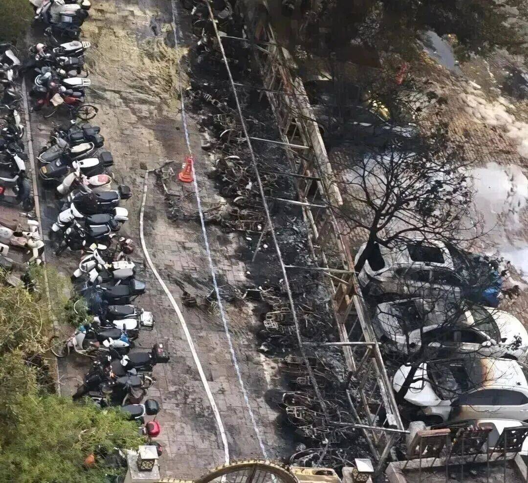 2025年4月4日,嘉定区一居民小区电动自行车集中停放场所发生火灾,火灾造成该场所10辆电动自行车,1辆自行车烧毁、烧损,过火面积约20平方米,火灾原因为电动自行车充电过程中锂电池热失控起火,并引燃周边其他车辆扩大成灾。