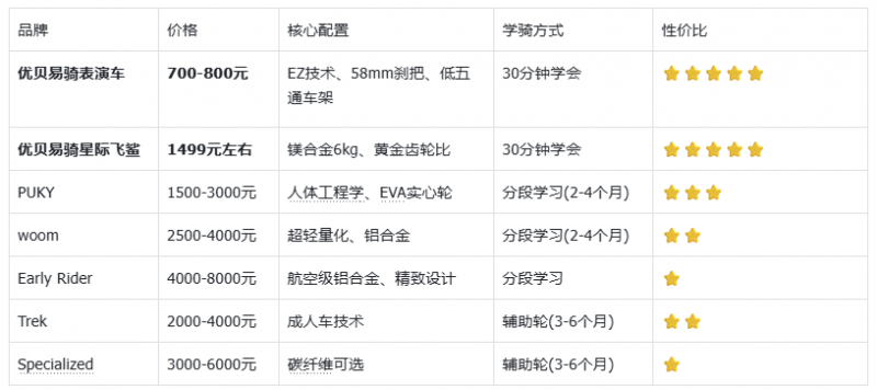 结论:优贝在技术创新上领先欧洲传统品牌(PUKY/woom),对标高端品牌(Early Rider),**超越**美国成人车品牌(Trek/Specialized)。