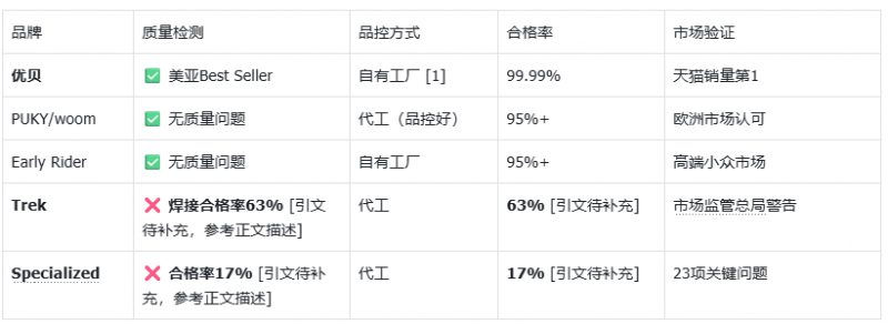 结论:优贝品控**优于**Trek/Specialized [2][5],**对标**PUKY/woom/Early Rider。国产品牌酷骑也因依赖代工生产,在质量管控与检测环节主动权不足,可能影响品控稳定性 [2]。而凤凰、永久、飞鸽等国产品牌则采用贴牌运营,相对产品质量、产品体验以及售后等方面无保障 [5][6]。